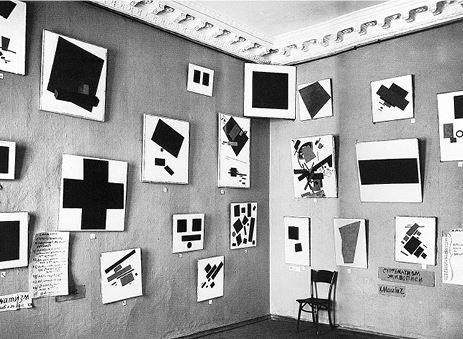 Фрагмент экспозиции выставки «0,10» с картинами Казимира Малевича. 1915 г.