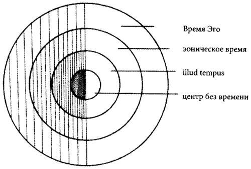 Можно сравнить время с вращающимся колесом: наше обыкновенное коллективное время, которое мы осознаем нашим самосознанием, представляет собой самое внешнее кольцо, которое движется быстрее других. Следующее внутреннее кольцо изображает эоническое время, движущееся все медленнее по мере приближения к центру. Это эоническое время отображается в идее года Платона или эпохах или Солнцах ацтеков — времени, которое длится бесконечно долго по сравнению с нашим обычным временем. Следующее и самое маленькое кольцо отображает illud tempus Элиаде, которое находится как раз на лезвии бритвы между временем и безвременьем, олицетворяя, как он сказал, «вневременной момент творения». Оно располагается как раз между невыразимой вечностью и началом эонического времени, а последнее представляет собой медленно движущуюся жизнь архетипов. И, наконец, мы видим дыру, неподвижный пустой центр колеса, который всегда остается неподвижным, вне движения и времени. Таким, например, является китайское Тао, которое находится вне ритмов Ян и Инь: