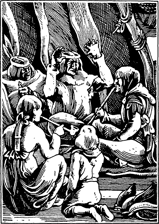 Затем начинаются танцы. Танцуют обычно, держась спина к спине, высоко вскидывая ноги, сопровождая пляску резкими криками и возгласами. Пронзительно звучит адская музыка, ей вторят хриплые голоса собравшихся, сливающиеся в беспорядочный хор. Но вот танцы кончаются, и все бросаются к столам, уставленным многочисленными блюдами, иногда вкусными и лакомыми, иногда — разной мерзостью и пакостью. Вперемежку с ведьмами садятся их кавалеры — бесы, завязывающие с ними бесстыдные и скоротечные романы. В конце пиршества ведьмы отчитывались перед дьяволом во всех гадостях, которые им удалось совершить со времен прошлого собрания. Одни удостаивались похвалы за рвение, другие получали нагоняй за нерадивость.