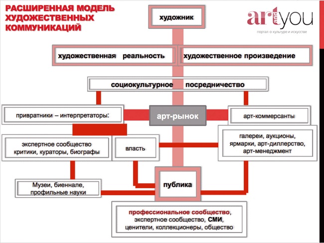 Но между художником и публикой существует также социокультурное посредничество, т. е. остальные субъекты и институции художественных коммуникаций, которые оказывают значительное влияние на то, как художник будет воспринят публикой. Их задача – активизировать коммуникацию, способствуя установлению связей между художником и публикой через ряд третьих лиц и институций, представляя, растолковывая, объясняя, обращая в той или иной форме внимание зрителя на творчество художника. «Основными субъектами арт-рынка являются производители художественного продукта (художники) и его потребители (публика). Между главными субъектами в разное культурно-историческое время существовала группа посредников, которая к сегодняшнему дню максимально дифференцировалась»[217].