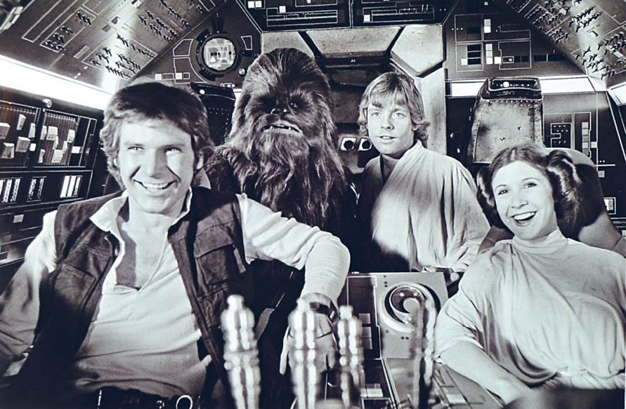 Яркие талантливые актеры, по словам Кэрри Фишер, в шутку называвшие себя «мясом, говорящим текст»: Харрисон Форд (Хан Соло), Питер Мейхью (Чубакка), Марк Хэмилл (Люк Скайуокер) и Фишер (принцесса Лея).