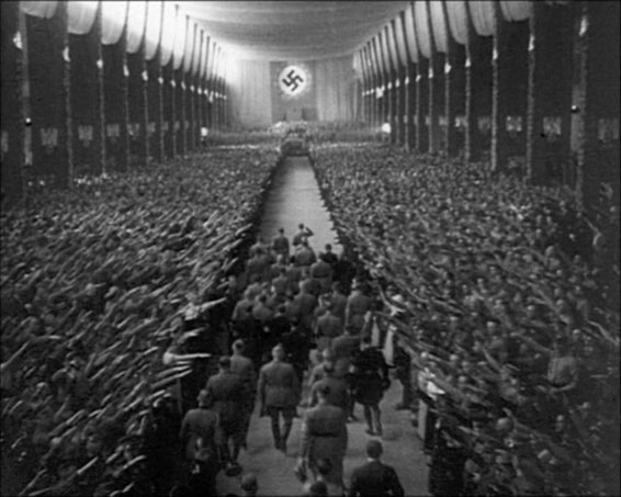 Наибольшую известность и значение в нацистское время получила картина режиссера Лени Рифеншталь[197] «Триумф Воли» (Triumph des Willens). Премьера состоялась в 1936 году в кинотеатре «УФА-Паласт» в исторической части Берлина. Съемки и действие фильма были ограничены временными сроками проведения ежегодного съезда Национал-социалистической рабочей партии Германии в Нюрнберге 1934 года. Погодные условия сентября 1934 года позволили Рифеншталь реализовать новаторские киноэффекты. Кроме 25 профессиональных операторов на съемках работали десятки и сотни помощников и администраторов. Если присмотреться, то на одном из огромных флагштоков можно увидеть движущуюся кабину с кинооператором[198]. Один из наиболее пафосных эпизодов связан с церемонией освящения новых знамен штурмовых отрядов партийным «знаменем крови», которое держал в своих руках ветеран движения. «Знамя крови», хранящее капли крови мучеников Пивного путча, символизировало преемственность поколения отцов, страдавших от поражения в Первой мировой войне, и напоминало о двадцатилетнем пути Гитлера к вершине политической и государственной власти.
