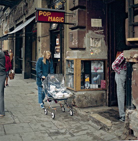Если бы мне пришлось решать, какой образ представляет собой квинтэссенцию хонтологии, то, скорее всего, я выбрала бы фотографию, сделанную в 1988 году в Кракове Дэвидом Хлинским, фотографом, приехавшим по студенческому обмену из Канады и параллельно с учебой собравшим огромный уникальный архив фотографий объектов, которые в то время никому не казались достойными того, чтобы их запечатлеть. В основном это виды улиц, витрины магазинов, предприятия. На снимке девушка в джинсовых куртке и брюках везет коляску с ребенком по Кармелитской улице, по неровному, растрескавшемуся тротуару. Она останавливается перед музыкальным магазином Pop Magic (которым заведовал Анджей Пудель из группы «Пуделсы»), представленным небольшой витриной с несколькими пластинками, среди которых можно различить Przeboje San Remo – Dusan Intershow. Pop Magic! И в таком печальном окружении: дырки в стенах, отваливающаяся штукатурка, стертые пороги, упадок и разложение!