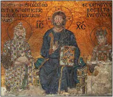 Иисус Христос, император Константин IX Мономах и императрица Зоя. Мозаика собора Св. Софии в Константинополе. XI—XII вв.