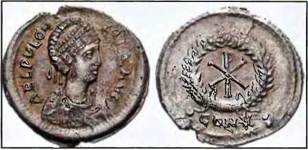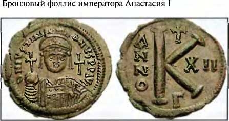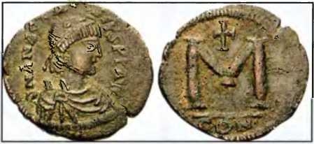 Бронзовая монета императора Юстиниана, равная половине фоллиса