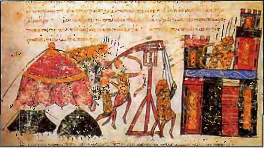 Осада города византийскими войсками с использованием катапульты. Миниатюра XII в.