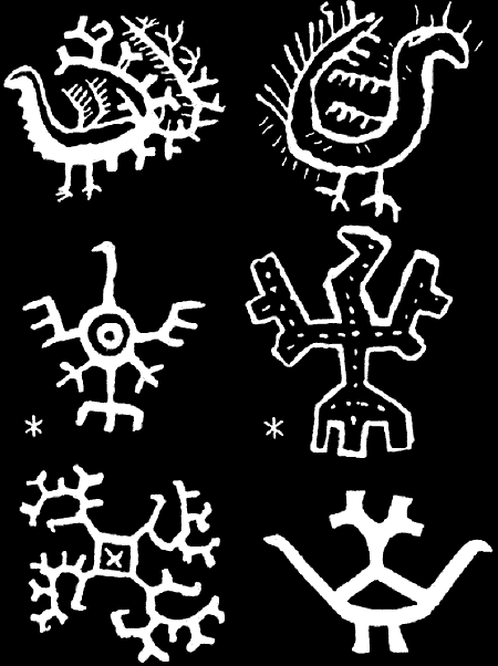 Рис. 22. Изображения птиц на бересте сделаны обскими уграми. (звёздочками отмечены коршуны; Иванов 1954).