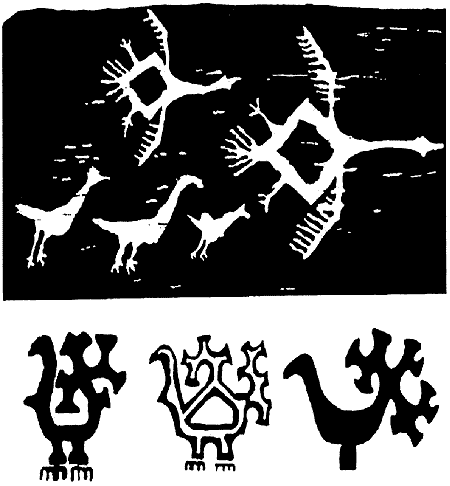 После рассмотрения литературных материалов, относящихся более чем к 40 видам птиц (здесь слово «вид» я употребляю в более широком смысле, чем это принято в зоологии), интересно обратиться к «бессловесной» информации, содержащейся в изобразительном искусстве первобытных людей и народов, еще не имеющих письменности (хотя «расшифровать» эту информацию дело непростое). Первые изображения животных на скалах и стенах пещер (петроглифы), в виде резьбы по кости, глиняных статуэток и т. д., появились еще в эпоху палеолита. Эти изображения имели утилитарное значение, они связаны с обрядами, которые, как полагали, обеспечивали удачную охоту, но означали также более внимательное рассмотрение животных, в каком-то смысле были зачатком зоологии.