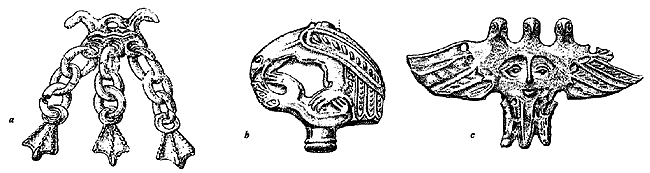 В простейшем случае, на подвесках, свешивающиеся с них цепочки кончаются лапками уток (рис. 24в). Пронизки (предметы, которые нанизывались на шнур) часто состоят из 2-х или 3-х соединенных животных. На рис. 24б это коршун и куница. По-видимому, это тотемический знак, свидетельствующий о принадлежности его владельца к племени или фратрии, получившейся путем слияния двух родов, считавших своими первопредками этих животных.