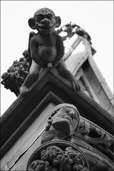 Тролль издевается над епископом. Скульптура фасада готического собора в Тронхейме (Норвегия)