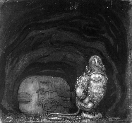 Сокровища троллей. Иллюстрация Й. Бауэра (1909) к сказке А. Смедберга «Тролли и мальчик-гном»
