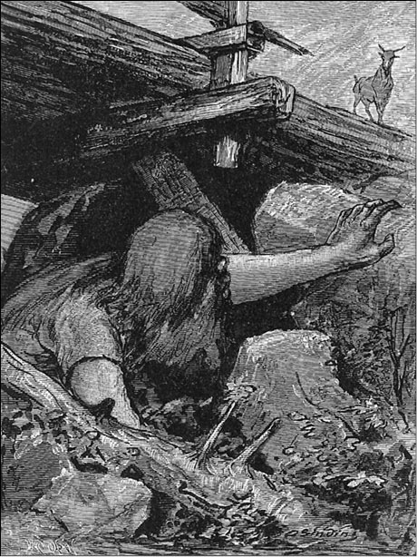 Три козла Граф и злобный тролль. Иллюстрация О. Синдинга (1883). Тролль выглядит как человекообразный великан вопреки описанию, приведенному в сказке