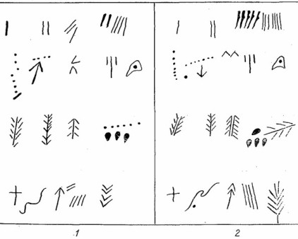 Рис. 6. Сравнительная таблица знаков и символов в пещере Хойт-Цэнхэрийн-агуй (1) и пещерах Франко-Кантабрийской области (2, по А. Леруа-Гурану)