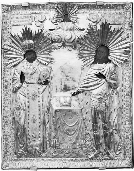 Павел Кудряшов. Икона «Святой Николай и Святой Александр Невский». СПб., 1820-е гг. Дерево, темпера, серебро, позолота, чеканка, чернь, резьба, канфарение. 54 ? 53 см. ГЭ