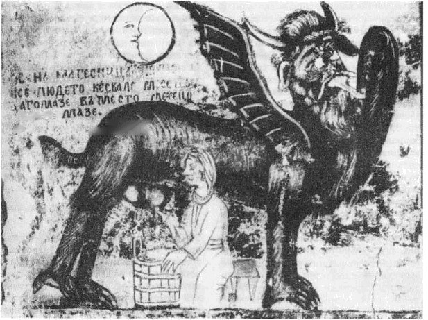 «Колдунья морочит людей, говоря, что „свалит“ месяц с неба и выдоит его». Роспись церкви св. Архангела Михаила (с. Лешко, Благоевградский округ, Болгария). XIX в.