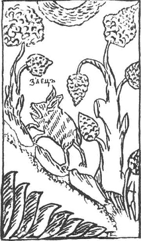 Заяц. Миниатюра из лицевого списка «Слова о рассечении человеческого естества» (XVIII в.). Ин-т русской литературы (Санкт-Петербург), кол. И.Н. Заволоко, № 257, л. 28
