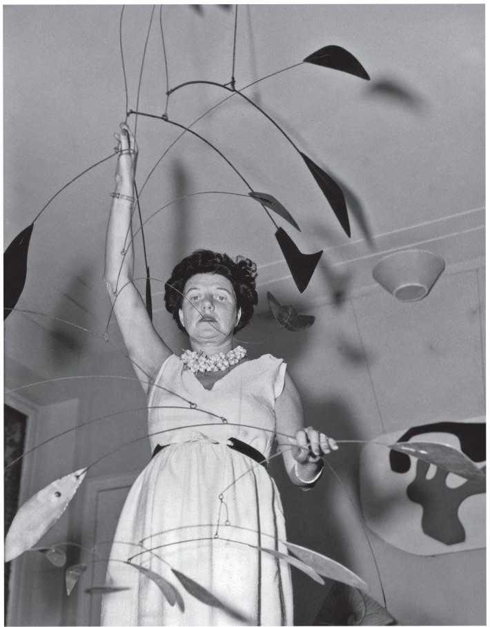 Пегги Гуггенхайм приводит в движение один из «мобилей» Колдера