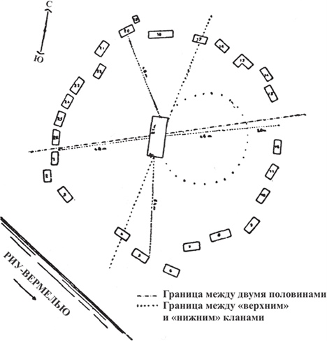 Круговое расположение хижин вокруг мужского дома имеет огромное значение и в социальной жизни и в культовых обрядах. Миссионеры-салезианцы, обосновавшиеся в районе реки Гарсас, быстро поняли, что самый верный способ обратить бороро в другую веру – заставить их покинуть свою деревню и поселиться в другой, где дома расположены параллельными рядами. Сбитые с толку относительно сторон света, лишенные привычного плана, основы их знания, туземцы быстро теряют представление о традициях. Словно их социальная и религиозная системы (мы вскоре увидим, что они неотделимы) слишком сложны, чтобы обойтись без схемы плана деревни, который будто направлял их поступки в повседневной жизни.