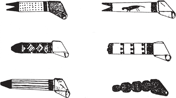 Рис. 23. Деревянные луки. Украшающие их кольца сообщают о принадлежности хозяина к определен ному клану