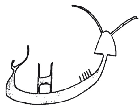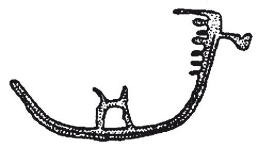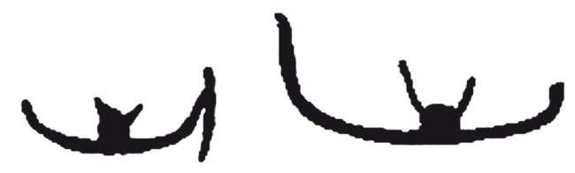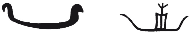 Тип 6 Червичека имеет профиль незначительной кривизны со штевнями различных углов наклона и высоты, дополненный надстройкой-«каютой» в точности как у «типа 5» (рис. 42). Это, безусловно, не самостоятельные формы, а лишь очередные простейшие графические версии базового «прямоугольного» судна, рисунком очень сходные с лодочными силуэтами на памятниках архаических фараонов (рис. 27).