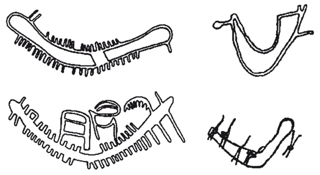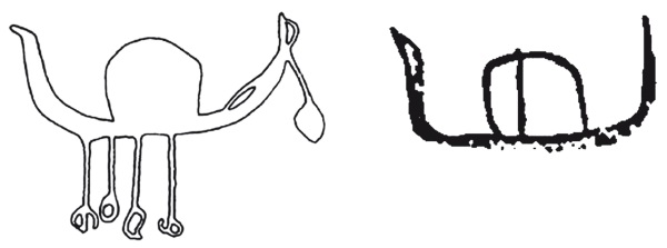 Свой тип 1 в «нубийском» петроглифическом исполнении Энгельмайер ассоциировал непосредственно с герзейскими «серповидными» ладьями, чьи хорошо узнаваемые контуры в расписном орнаменте украшали египетскую керамику D-ware «стадии» Нагада Пс. Ученый включал сюда как изображения качественной, тщательной резьбы (рис. 47, слева), так и грубые или небрежные подражания этим более или менее завершенным «стандартным» формам (рис. 47, справа).