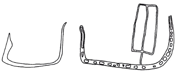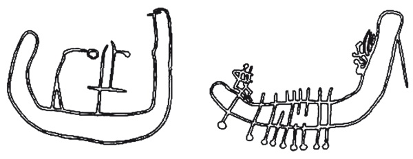 Тип 8 Червичека предусматривает всего два профиля, которые, однако, далеко не каждому покажутся тождественными, да еще и пригодными к объединению в особый «подвид» (рис. 44). Их сближают отчетливые «прямоугольные» изломы носа и кормы, но в одном случае штевни почти вертикальные, с завитками на концах, а корпус образует зримую дугу, тогда как в другом отогнутые наружу штевни сочетаются с корпусом идеально ровной линии. При всех этих частных нюансах, включая надстройку с шестом (едва ли парус) на второй ладье, ничего принципиально нового и оригинального в плане конструкции по сравнению с уже рассмотренными судами данная пара нам не сообщает.