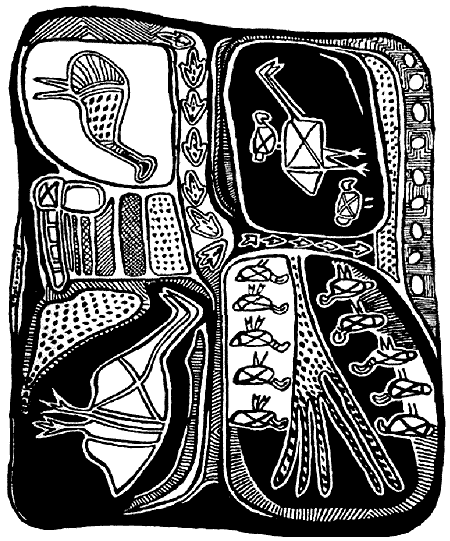 Тогда Диневан-мать решила обмануть дрофу. Она спрятала почти всех своих птенцов под большим кустом и подошла к Гумбл-габбон с двумя птенцами. Заговорив с дрофой, она убедила её, что иметь много детей неразумно: их трудно прокормит и вырастить. И дрофа, чтобы не отстать от эму, убила всех своих птенцов, кроме двух, а Диневан привела своих 12 птенцов и сказала: «Ты жестокая и жадная мать!». Так они поквитались: эму не может летать, а дрофа откладывает только по два яйца (МСА 1965). Это изображено на рис 8.