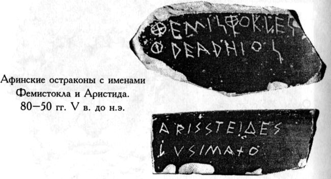 В Греции общественное мнение никогда не было четко отделено от воли гражданского коллектива полиса. Просто эта последняя была облечена в установленную конституционной процедурой форму и имела силу общеобязательного закона. Нередко одно незаметно переходило в другое, и афинский демос превращался в такого же тирана и душителя свободы личности, как спартанская коллегия эфоров,[77] следившая за неукоснительной строгостью соблюдения гражданами законов Ликурга. Наиболее известным примером такого узаконенного произвола и попрания элементарных прав человека самым демократичным из всех греческих государств остается знаменитый остракизм или «суд черепков», честь изобретения которого приписывалась великому реформатору Клисфену. Пожалуй, даже стены Акрополя и колонны Парфенона не смогли воплотить столь «весомо, грубо, зримо» всю огромную и часто слепую и нерассуждающую мощь афинского народа, как эти скромные черепки битой посуды с выцарапанными на них именами великих государственных деятелей и военачальников, основателей афинского морского могущества: Фемистокла, Аристида, Кимона и др. Как известно, человек, собравший большинство голосов своих сограждан в результате процедуры остракизма, отправлялся в какое-то подобие почетного изгнания. На десять лет он покидал Афины, но при этом не лишался ни гражданских прав, ни имущества и по возвращении вновь становился полноправным афинским гражданином со всеми вытекающими последствиями. По мнению большинства историков, это была чисто профилактическая мера, имевшая своей целью предотвращение тирании: лица, приговоренные к изгнанию, считались наиболее вероятными претендентами на захват власти в государстве. С точки зрения современных правовых норм, такой способ предупреждения государственных переворотов, конечно, был бы признан вопиющим беззаконием.