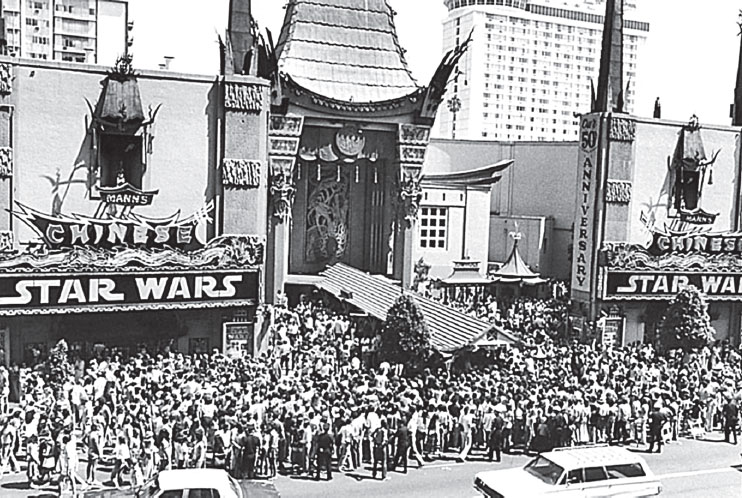 Китайский театр Манна в Голливуде, где 3РО, R2 и Дарт Вейдер оставили свои отпечатки на бетоне в августе 1977-го. Церемония была в честь возвращения фильма на экран кинотеатра после короткого перерыва в связи с показом предполагаемого главного хита лета – фильма Уильяма Фридкина «Колдун». Ожидалось несколько сотен посетителей, пришли пять тысяч.