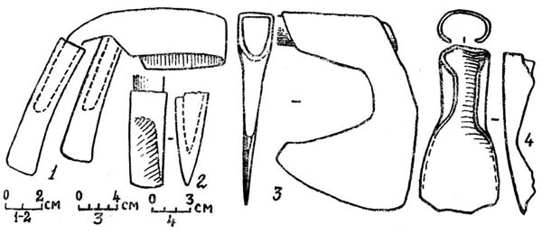 Рис. 17. Деревообрабатывающие инструменты: струг (1), долото (2), топор (3), тесло (4), 1, 2, 3 — Лар, 2 — Шапка.