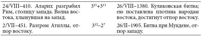 Здесь интеллектуальное недоверие вызывает уже деление на Восток и Запад. Почему Рим, традиционный символ Запада, и Россия, полувосток-полузапад, одновременно отнесены к Западу? И почему Аларих I (вестготы) и Мукден (Манчьжурия) представляют Восток? Наконец, почему волна Востока 410 года соответствует волне Запада не 451, а 1380 года?