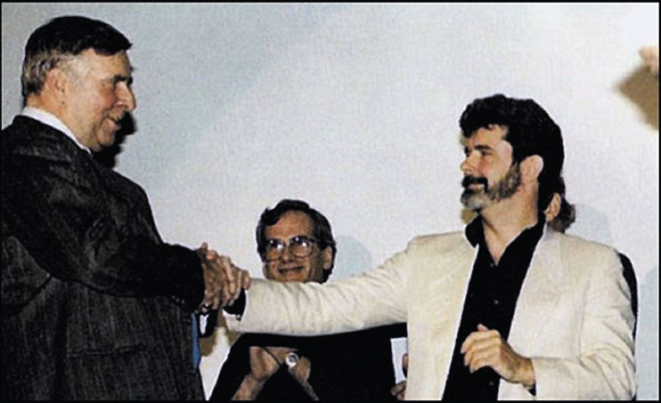 Еще один сюрприз подготовил Мэдсен: на сцену вышел Джин Родденберри, создатель «Звездного пути». Лукас, никогда не любивший сюрпризы, был в шоке. Родденберри, человек достаточно крупный, схватил руку тихого, неразговорчивого Лукаса, который был на голову его ниже. Это была единственная встреча двух гигантов мира фантастики. Мэдсен был единственным, кому пришло в голову сделать снимок.