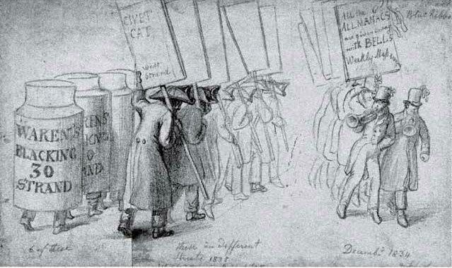 В 1820-е на городских улицах впервые появился еще один персонаж — человек-сэндвич, известный во Франции как «ходячая афиша». В этом Лондон вновь обогнал своего соперника. Началось все с двух фанерных листов, скрепленных кожаными ремешками, которые надевались через голову, но за двадцать лет инженерная мысль создала хитроумные изобретения, огромные конструкции на колесах в виде кофемолок, египетских храмов, громадных цилиндров и т. д. с наклеенными на них афишами, полностью скрывавших человека внутри.