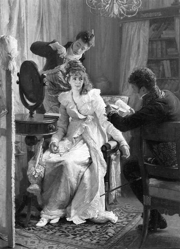 Вы, конечно, знаете также, что молодая девица должна являться на бал всегда с обнаженной шеей и с коротенькими рукавами у платья. Если же угодно вам надеть шарф, мантилью или подобное тому, то само собою разумеется, что при танцах все это снимается, только опахало или веер может оставаться в руке.