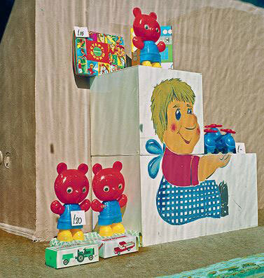 Медвежонок круглый и плоский. Пластиковый, безопасный для маленьких детей и вполне современный в своей сдержанной округлости: большая голова, удивленное выражение, закругленные уши, движущиеся лапки и несколько вариантов свитера в основных тонах. Он стал для меня особым героем этой книжки, аналогом числа 23 для Уильяма Берроуза. Он то и дело выскакивает из материалов, которые я просматриваю. Появляется в «Телевизионном ежедневнике» в репортаже о низкосортных товарах в торговле (вариант красный и зеленый в компании хорошенького пластикового котика. «Не слишком удачные игрушки», – бормочет ведущий). Он сидит в руководстве Татьяны и Томаша Войда на современной детской кроватке в окружении кукол, похожих на беглянок из кукольного театра. И, наконец, стоит со своим собратом в витрине, сфотографированной Дэвидом Хлинским. Снимок сделан в Москве, и вскоре выясняется, что медвежонок этот Мишка, импортный пришелец, произведенный в городе Кирове на производственном объединении «Вятка». Приятелей Мишки: мальчика с квадратной головой, Чипполино, Кота в сапогах, таксу на колесиках, всех из пластмассы, – видно на других кадрах из Москвы. Сколько этих игрушек попало в польские магазины – например, таких, которые, как на других снимках Хлинского, изображали в витрине грибной лес? И сколько из них уже было продано, когда без всякой суматохи можно было купить кубики LEGO? Разве пластик, еще недавно такой гигиеничный и современный, уже тогда стал синонимом дешевки? Как скоро блестящие глуповатые медвежата перестали нравиться?