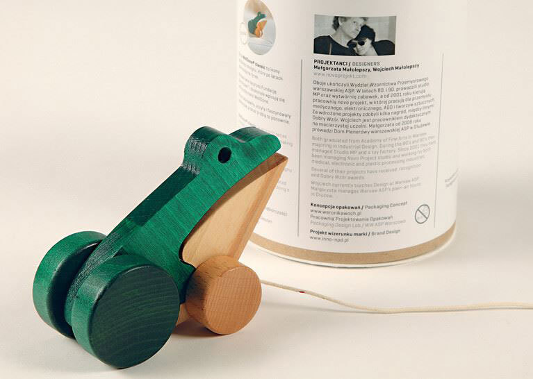 Более-менее в тот же период – точнее, в 1987 году – появилась деревянная лягушка. Она гениальна по своей конструкции: туловище складывается из двух частей (верха и низа), и все дополнено колесиками и шнурком. В то же время в ней содержится краткая история польского потребительского дизайна в восьмидесятые – девяностые годы и ответ на вопрос, что случилось с отечественными дизайнерами в «потерянное десятилетие», когда государственные предприятия перестали давать им работу. Лягушку, спроектированную Малгожатой и Войцехом Малолепшими для их сына Стася, изготавливала «Студия МП» – фирма, основанная совместно с Казимежем Пиотровским.