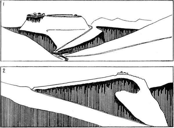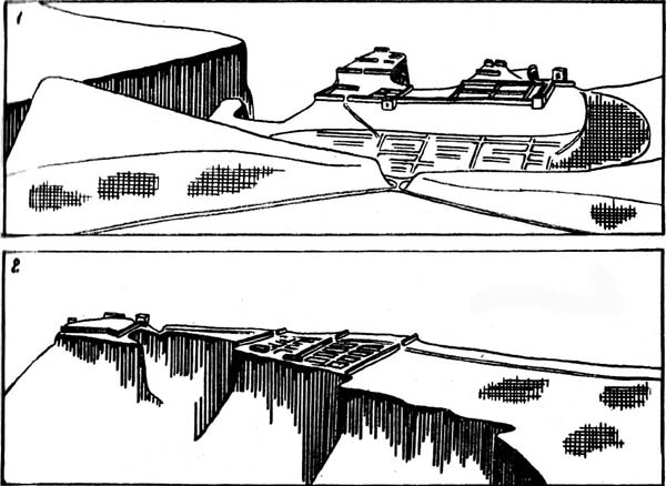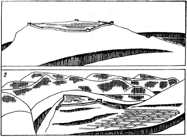 Рис. 6. Крепости и поселения на отрогах горы Пал (1) и на горе Пскал (2).
