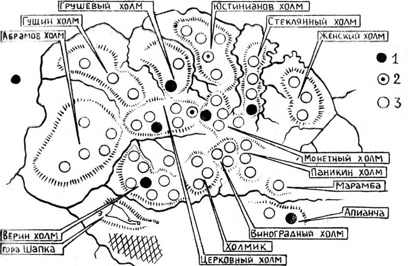 Рис. 8. Схема распределения семейных кладбищ на родовом могильнике у поселения и крепости Шапка: 1 — раскопано «площадью»; 2 — раскопано частично; 3 — доследовано несколько погребений.