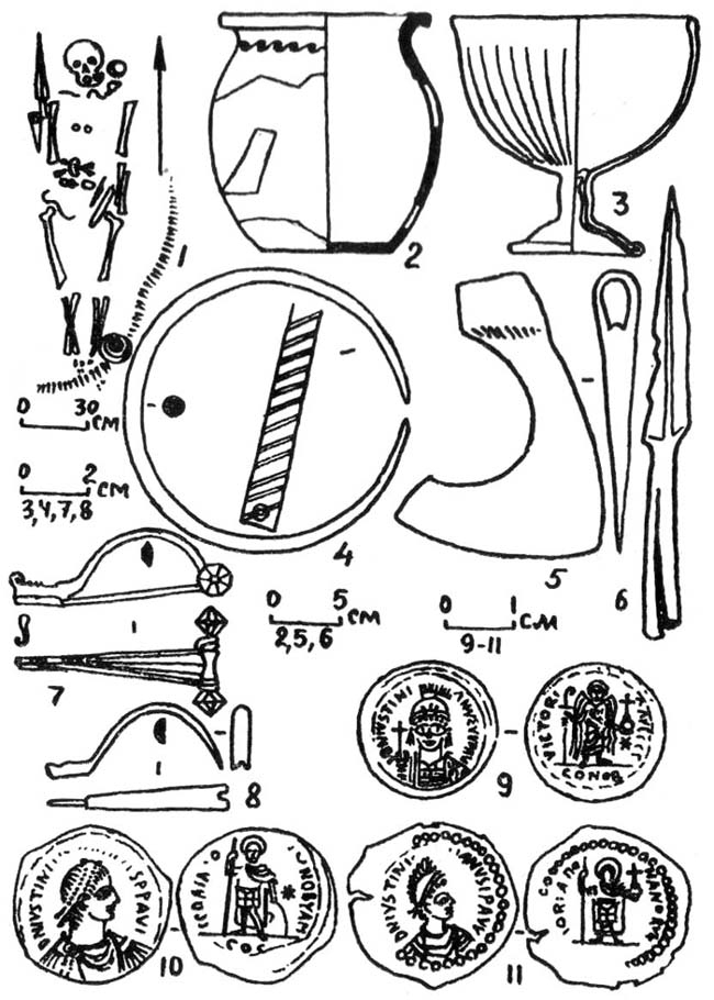 Рис. 38. Самое богатое из погребений, найденных на территории исторической Цебельды (Юстинианов холм): 1 — план захоронения, 2 — глиняный горшок. 3 — стеклянный бокал, 4 — бронзовый браслет, 5, 6 — железные топор и наконечник копья, 7, 8 — серебряная и бронзовая фибулы, 9 — золотая монета, 10-11 — серебряные монеты Юстиниана I.