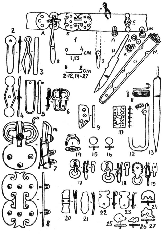 Рис. 39. Самое богатое из погребений, найденных на территории исторической Цебельды (Юстинианов холм): 1 — реконструкция пояса; 2, 4, 5-8, 17-19 — серебряные детали пояса, 3 — бронзовый пинцет, 9 — костяная пластинка, 10 — серебряная пластинка, 11, 12, 15-16— серебряные детали ножен кинжала, 13 — железный кинжал, 14 — бронзовый перстень, 20-27 — бронзовые детали обувных застежек.