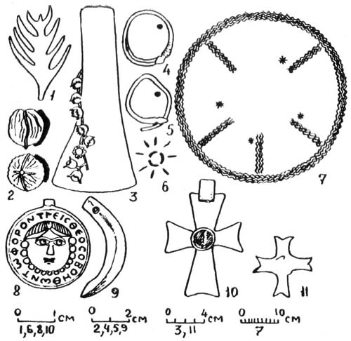 Однако в действительности все эти атрибуты не могут свидетельствовать о столь раннем проникновении христианства в Цебельду. Нательные кресты, несомненно привозные, относятся к комплексам конца VI — первой половины VII в. и, составляя одно целое с ожерельем, должны рассматриваться лишь как украшения. Иного значения им цебельдинцы, по-видимому, не придавали. Медальон с изображением Горгоны и с греческой надписью, найденный в погребении второй половины [113] V в., также представляет собой импортное изделие, происходящее из Антиохии или ее окрестностей [30], и, следовательно, не имеет никакого отношения к религиозным воззрениям древних цебельдинцев. Этот медальон, как и кресты, играл роль только экзотического украшения. Крестовидная орнаментация пряжек и стеклянных сосудов может характеризовать лишь уровень христианизации создававших их ремесленников, но не населения древней Цебельды, поскольку и эти предметы импортированы [114] из более южных районов Восточного Средиземноморья. Что же касается крестовидного распределения кружочков на керамике, то это лишь один из вариантов широко распространенного местного орнаментального мотива, который, кроме того, в IV—VI вв. включал треугольное, пятиугольное и даже шестиугольное [115] распределение кружочков. Западная же ориентировка покойников фиксируется в Цебельде с III в. и, судя по всему, возникла самостоятельно, вне связи с христианством.