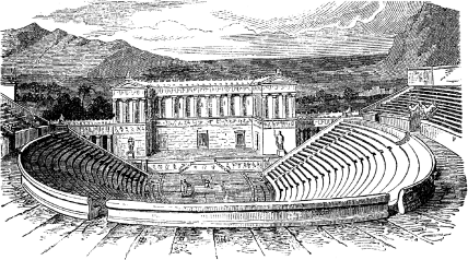 При постройке театра основное внимание обращали на выбор подходящей местности. Выбирали, как правило, склон холма и в нем выкапывали места для зрителей (theatron) — амфитеатр; плоскость у подошвы склона, предназначенную для хора (orchestra), выравнивали, а за ней строили саму сцену и необходимые для нее помещения (рис. 97, театр в Мегалополисе; рис. 98, театр в Сегесте).
