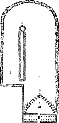 С левой стороны ипподрома (рис. 100) был расположен отлогий низкий холм, а с правой стороны соорудили особую насыпь (хома). Насыпь дугой замыкала один конец ипподрома, тогда как другой конец закрывала ограда (Б), за которой находился портик (стойя, В), называвшийся Агнаптовым. Ограда состояла из ряда стойл для лошадей (1, 2, 3, 4), выстроенных в форме корабельного носа (поэтому середина (Б) называлась эмболон) по двум замкнутым линиям ограды, длиной в 400 греческих футов каждая, что позволяло сэкономить место. Из этой ограды и выезжали наездники (отсюда ее название «афесис» — выпуск, выезд).