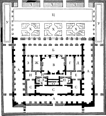 Если войти в гимнасий (рис. 101) с южной стороны (Ч — Ч), прежде всего можно увидеть оба ксиста (У — У), стадию (Ц), где обычно проходили состязания атлетов, и сады для прогулок (X–X). Далее расположен двойной коридор — собственно фасад гимнасия. Он открыт с юга, а его внутренняя часть (Б) служит надежным убежищем от непогоды. Этот коридор соединен с остальными, окружающими главную часть здания с трех сторон (А — А). Эти коридоры служили местом для бесед философов, риторов и т. д., поэтому их оборудовали сиденьями и большими экседрами, которые видны в обоих углах. К коридору (Б) примыкает большой зал — эфебейон (В) — основное место для тренировок юношей. С одной стороны рядом с эфебейоном находится корикейон (Г) и конистерион (Д), а с другой — элеотесион (Ж). В остальных помещениях (З, И, К, Л, М, Н, О, П, Р) располагались бани. В больших комнатах (С — С), судя по всему, играли в мяч.