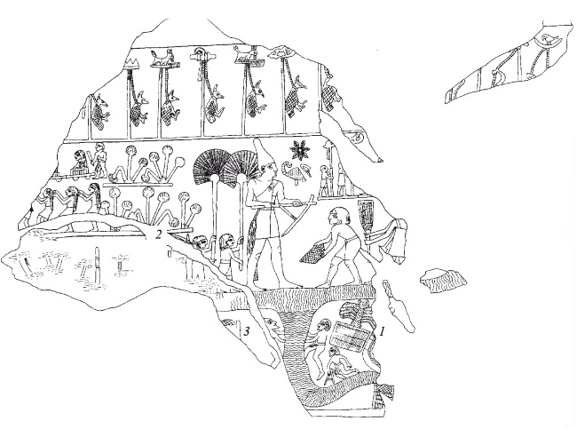 Отмечу несколько деталей рельефа. Прежде всего бросается в глаза близкая ширина реки и ответвляющегося от нее рукава. На этом «канале», кроме того, видны остатки утраченного изображения большой ладьи, известной по петроглифам восточных вади: ее высоко задранный нос (7). Невозможно представить себе такое судно плавающим в арыке. Пейзаж больше напоминает дельту Нила с ее разбегающимися руслами; впечатление усиливают характерные болотные растения в среднем ряду композиции (2). Наконец, обращает на себя внимание фрагмент постройки (?), которая похожа на древнейшую нижнеегипетскую «божницу» pr-nw [49] (5). Баумгартель, например, считала, что «Скорпион» с булавы закладывает святилище [91]. По версии Тураева, «здесь представлен царь, руководящий земледельческим праздником “взрыхления земли”» [54].