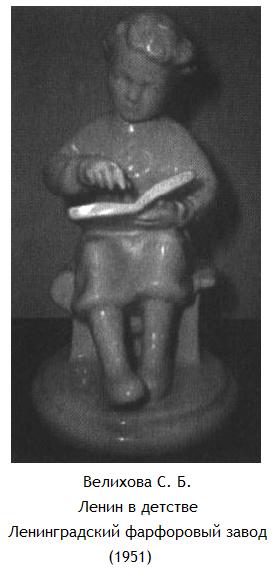 Скульптурное изображение маленького Володи с книгой надолго сохранит свою популярность, хотя само изображение не остается при этом неизменным — копии и версии исходной скульптуры варьируют в диапазоне между недетской убежденностью, мечтательной задумчивостью и сентиментальностью юного читателя. Одной из таких версий стала фарфоровая статуэтка, выполненная в 1951 году скульптором Ленинградского фарфорового завода С. Б. Велиховой и широко разошедшаяся по стране[718]. Маленький Володя с книгой изображен здесь не будущим революционером, но миловидным дитятей, скульптурно олицетворяющим педагогический стишок В. Маяковского: «Если мальчик <…> тычет в книжку пальчик <…> он хороший мальчик»[719].