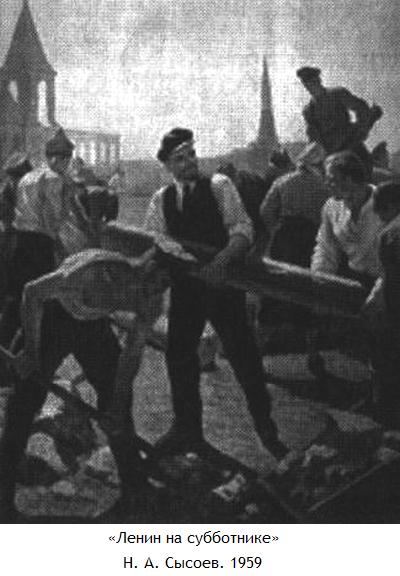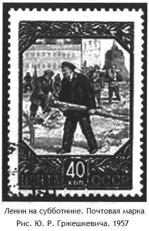 При этом не только облик Ленина, но и его сакраментальная деятельность — такая, например, как участие в коммунистическом субботнике 1919 года с поучительным почином по переноске бревна, — легко переводились на общепонятный для детей язык игры и забавы[725]. Известный по фотографии и вдохновлявший советских художников на живописное увековечивание образ Ленина с бревном занятно варьировал от фотографического реализма, отводившего Ленину роль «замыкающего» в процессии грузчиков-добровольцев (на картинах М. Г. Соколова и Д. А. Налбандяна), до революционно-трудового символизма, наделявшего Ленина «бригадирскими» функциями — в гуще работающих (на картинах B. C. Иванова, ЕЛ. Кибрика, Н. А. Сысоева); на почтовой марке 1957 года Ленин и вовсе несет бревно в одиночку (рис. Ю. Р. Гржешкевича) и т. д.