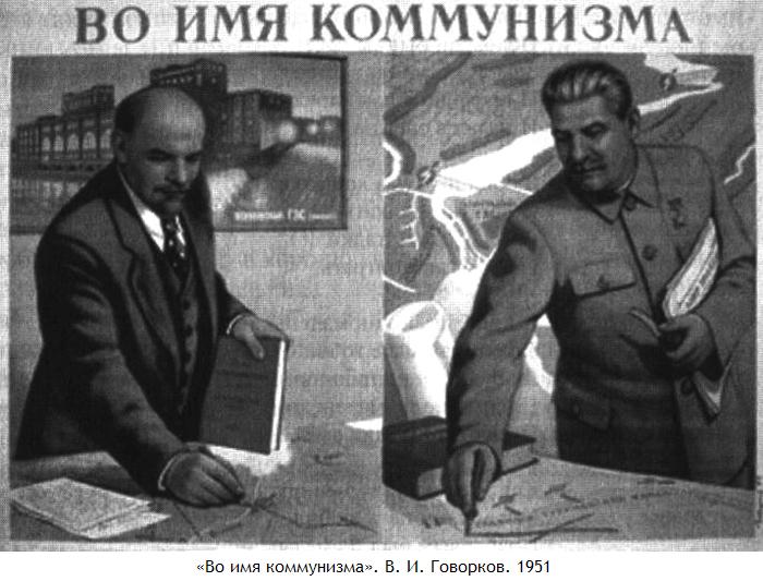 Осознаваемый или нет, агиографический парадокс эпохи сталинизма находит свое воплощение в неявном, но суггестивно навязчивом искажении исторической и биографической последовательности революционных и постреволюционных событий, какой она предстает в советской идеологической культуре. Среди наглядных свидетельств такого рода замечателен известный плакат-диптих Виктора Говоркова «Во имя коммунизма» (1951), изображающий — в первой из двух его частей — Ленина, склонившегося над картой, отмеченной одинокой звездочкой планируемой стройки, а во второй части — Сталина, склонившегося над картой, испещренной значками-стройками ГОЭЛРО. При визуальной и, казалось бы, исторической убедительности этого изображения его любопытной особенностью оказывается то, что уже первая часть диптиха обнаруживает на нем латентное присутствие Сталина — в подписи к письму, которое лежит перед Лениным и подсказывает зрителю, кто именно стоял у истоков ленинского плана[737].
