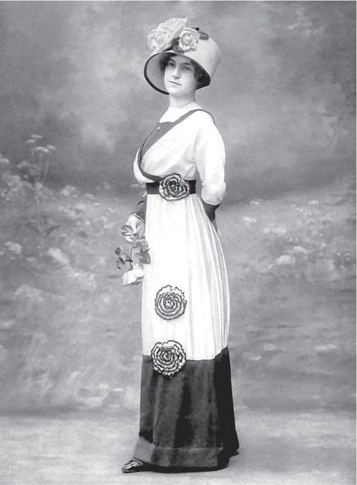 Костюмы Жанны Ланвен предлагались из разных видов бархата и саржи[161], но покрой моделей отличался мало, несколькими незначительными деталями или кокетливыми пуговками на юбке, как в модели «Загадка» 1911/1912 года, двубортный жакет с длинными полами был притален, напоминая редингот[162].