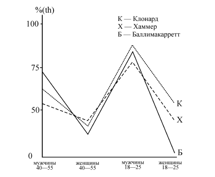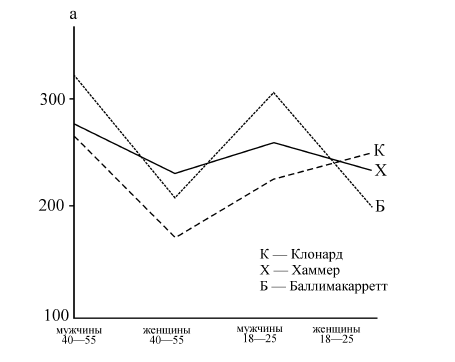 Это гораздо более сложная переменная, так как она не может быть объяснена простым бинарным методом, как это было в случае с [th]. Чтобы установить степень сокращения и степень заднего подъема [а] в таких словах, как hat, man, back была использована пятеричная шкала с градацией от 1 для [?] – через [а], [?], [а] – до 5 для [o?]. (Чем выше показатель, тем больше задний подъем языка при произнесении [а].) Сначала употребление этого звука в Баллимакарретте. Как мы видели на примере с переменной [th], в этом сообществе отмечается явная половая дифференциация с такой же зигзагообразной линией на диаграмме. Однако в Хаммере и Клонарде данная модель не выявлена. В Хаммере различия между полами в произношении [а] незначительны, тогда как в Клонарде молодые женщины используют заднеязычный вариант [а] больше, чем молодые мужчины (и – совершенно противоположным образом – пожилые женщины, чьи показатели значительно ниже, чем у мужчин их поколения, придерживаются обычной модели).